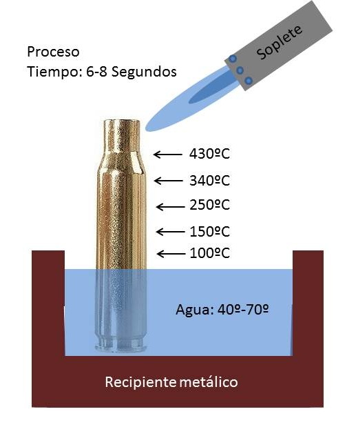 La forma más sencilla es utilizando un bandeja metálica, puede servirnos la de Horno de cocina, y un soplete, este sería conveniente que fuese del tipo de Gas combinado, la típica botella amarilla de Castolin pues alcanza un Dardo de llama más manejable y con un temperatura más alta que los típicos de Camping –Gas de propano con boquilla más ancha, estos últimos también pueden servir como comienzo. Colocamos las vainas de pie en línea en la bandeja, estas estarán tal y como salen del arma solo las limpiaremos con el fin de que el calor no deje marcas con la suciedad, después llenaremos de agua la bandeja cubriendo el culote de la vaina y 2 centímetros mas, con el fin de disipar el calor y que no se produzca el revenido del culote.
